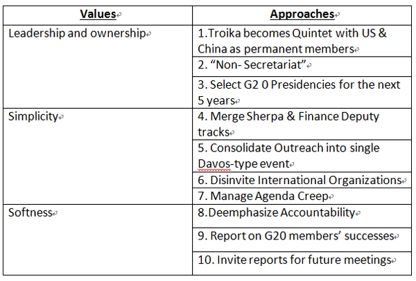 Format is substance. The preparatory process forG20 Leaders Meetings will determine future effectiveness. The G20 is overburdened. Leaders meetings are faced with unrealistic demands and excessive expectations. The G20 is an informal organization- it has no constitution, no bylaws, no secretariat, and no compliance mechanisms. It has no formal provisions for institutional memory or continuity. Yet every country and every organization want to participate in its agenda-setting and deliberations. The informal network is growing too fragmented and cumbersome, with so many meetings, outreaches, and consultations going on. There is also an increasing demand for an effective accountability mechanism to provide teeth for the informal process.