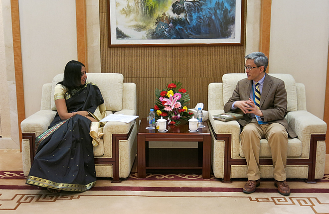 On April 10th, Mrs. Poornima Gunasekera, Consul General of the Democratic Socialist Republic of Sri Lanka visited SIIS and exchanged views on deepening academic cooperation between China and Sri Lanka with President Chen Dongxiao.