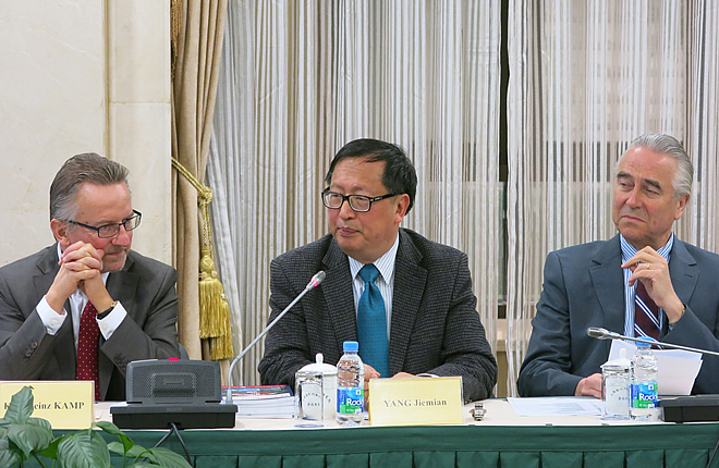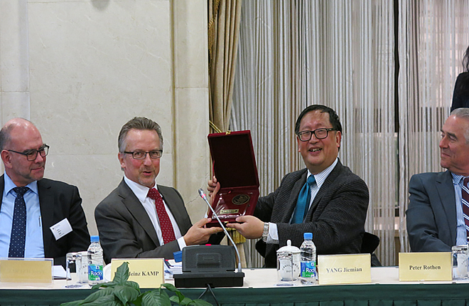 On February 19, 2016, delegation of German Federal Academy for Security Policy visited SIIS. Led by Mr. Karl Heinz Kamp, President of the Academy, the delegation was composed of scholars, officials, entrepreneurs and media professionals. Mr. Peter Rothen, German Consul General in Shanghai, also joined the meeting. Prof. Yang Jiemian, Chairman of SIIS Academic Council, Prof. Ye Qing, Assistant President of SIIS and other research fellows attended the meeting. The two sides had a discussion on China’s peripheral diplomacy, “One Belt, One Road” strategy, and economic development etc.