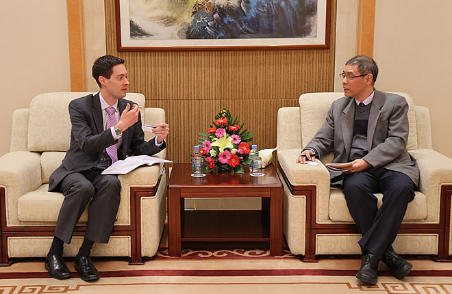 On Jan 14th, Mr. Jonathan J. Crawford, Political Consul from the U.S. Consulate General in Shanghai visited SIIS and discussed with Prof. Cai Penghong, Senior Fellow of the Institute for Foreign Policy Studies, and Prof. Wu Chunsi, Director of the Institute for International Strategic Studies, on South China Sea issue and North Korea nuclear issue etc.