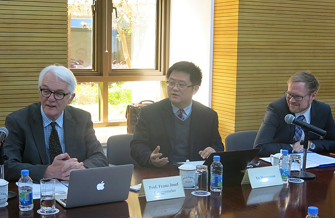 On March 28, 2016, Prof. Franz-Josef Brüggemeier, Internal Senior Fellow of the Department of Economic, Social and Environmental History, Albert-Ludwigs-University Freiburg (Germany) gave a lecture on “Sun, Water and Wind: the Transformation of Energy Use in Germany” to research fellows from the Center for European Studies and the Institute for Public Policy Studies, SIIS. Prof. Yu Hongyuan chaired the discussion. Stefan Pantekoek, Resident Director of Friedrich Ebert Stiftung (Germany) Shanghai Office, also joined the lecture.