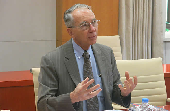 On May 9, 2016, Prof. David Shinn from the Elliott School of International Affairs, George Washington University visited SIIS. He had a discussion with Prof. Shao Yuqun, director of the Institute for Taiwan, Hongkong and Macao Studies, Dr. Xue Lei from the Institute for World Economic Studies, and Dr. Jin Liangxiang from the Center for West Asian and African Studies etc. on the cooperation of U.S and China in Africa and its challenges.