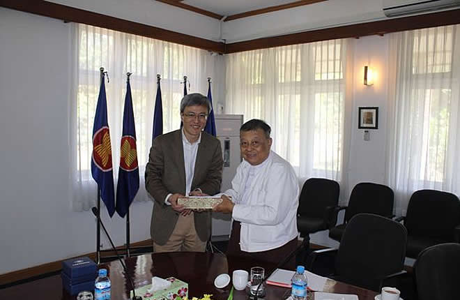 向缅甸战略与国际问题研究所主席Nyunt Maung Shein赠送礼品