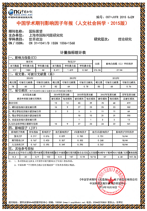 《国际展望》入选2015《中国学术期刊影响因子年报》统计源期刊