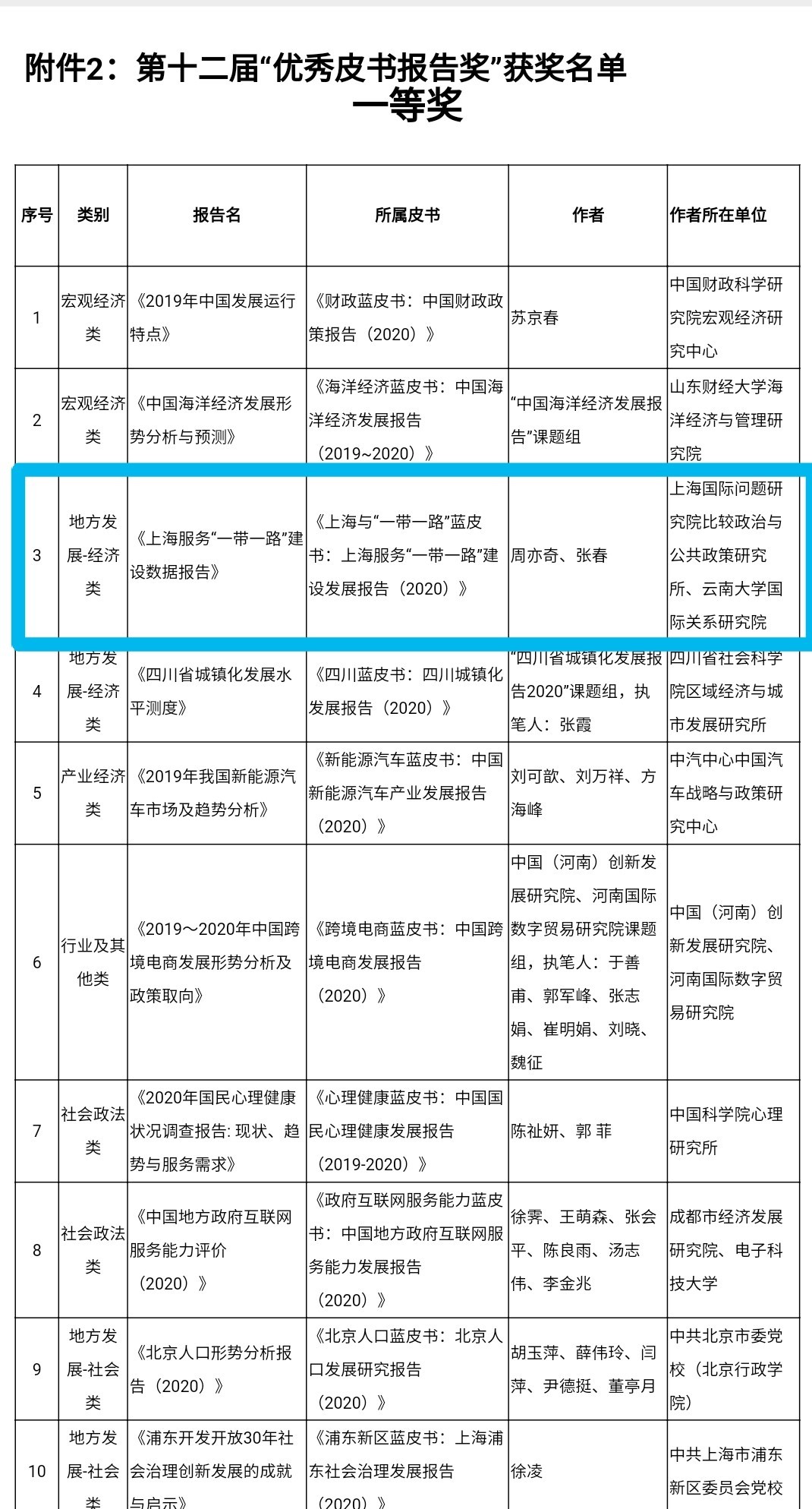 2021年9月15日,第六届皮书学术委员会成立仪式暨第十二届优秀皮书奖终评会在京召开。会议按学科专业分组对进入候选的皮书和皮书报告进行评审,评选出第十二届“优秀皮书奖”51个,“优秀皮书报告奖”63个。我院《上海服务“一带一路”建设数据报告》荣获第十二届“优秀皮书报告奖”一等奖。