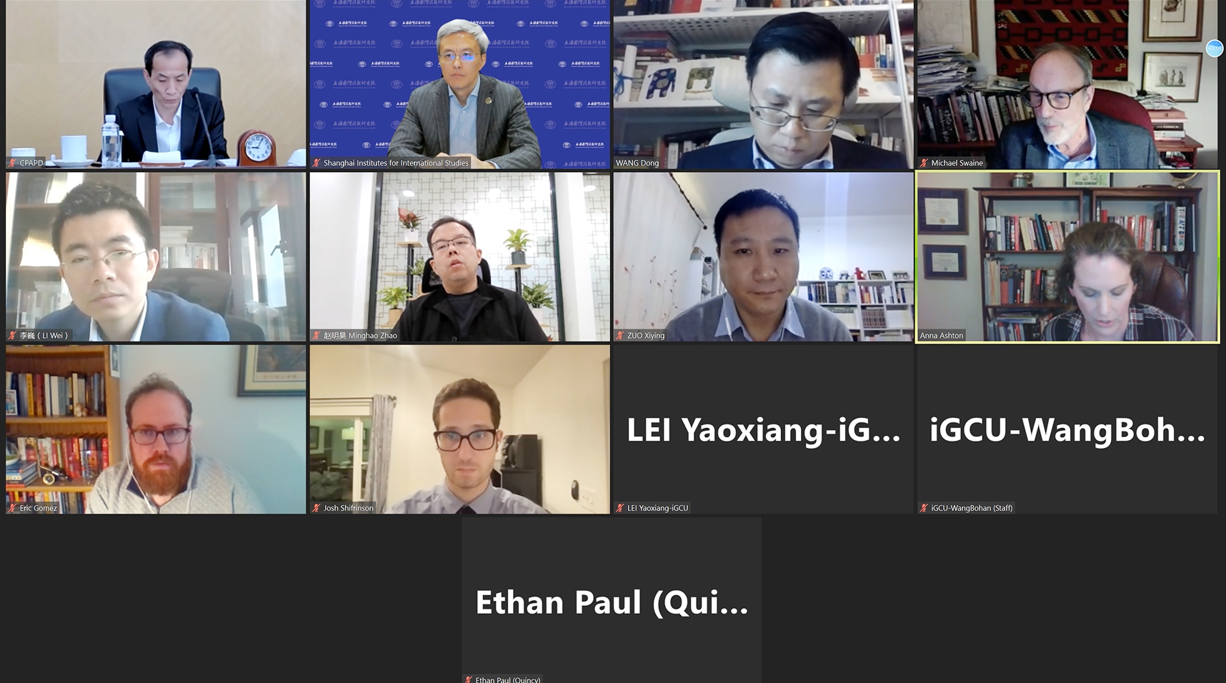 2021年10月28日,陈东晓院长参加”中美关系与东亚地区大国关系平衡“研讨会并做发言。北京大学中外人文交流研究基地执行主任王东做开幕辞,中国人民大学国际关系学院左希迎教授,昆西研究所(Quincy Institute)东亚项目主任迈克尔•史文(Michael D.Swaine),美中贸易委员会(US-China Business Council)政府事务高级主管安娜·艾希顿(Anna Ashton),卡托研究所国防政策研究主任埃里克·戈麦斯(Eric Gomez),中国人民大学国际关系学院李巍教授,波士顿大学国际关系副教授雷德里克·帕迪(Joshua Shifrinson)和复旦大学美国研究中心青年研究员赵明昊参加此次会议。中国人民争取和平与裁军协会副秘书长陶涛做闭幕总结。