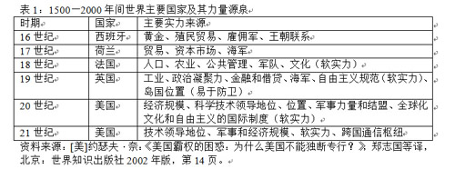 的确,如同雅典人在与弥罗斯人的辩论中所指出的,大家“都知道正义的标准是以同等的强迫力量为基础的;同时也知道,强者能够做他们有权力做的一切,弱者只能接受他们必须接受的一切”。[21] 而约瑟夫·奈的研究也表明,大国崛起的主要力量源泉可能因历史时期的不同而不同,但军事实力却是其中少有的常量之一(表1)。但需要指出的是,军事性崛起并不必然为经济性崛起提供有效保障,德国崛起过程中就反复出现这一悖论。德国自1871年实现统一后便被视作真实或潜在的威胁,其对待军事能力或军事性崛起的态度也几经变化,并导致了重大地不同的战略后果。在俾斯麦时期,如前所述,德国关注的主要不是军事性崛起,相反通过建构一种制度性框架使自身的崛起不被人严重反对。但在俾斯麦离职后,德皇威廉二世推出扩张性的“世界政策”挑战英国的海上霸权,迅速引发了第一次世界大战。而希特勒时期的德国甚至希望将“世界政策”“扩大一千倍”[22],其结果便是第二次世界大战。而在二战后,德国奉行和平政策并致力于推动欧洲一体化进程,今天德国已经成为欧洲和平与发展的主要支柱,特别是在当前仍持续的全球金融危机和欧洲债务危机之中。由此可见,军事性崛起是否对大国经济性崛起产生积极的保障作用,还需取决于如表1所示的日益多元化的大国力量源泉,特别是软实力或更为宏观的道德要素。紧随大国经济性崛起后的军事性崛起,如果没有其他要素的有效支撑的话,极易引发国际社会特别是既存体系主导国或霸权国家的危机感,并可能导致权势转移理论所论述的霸权战争。的确,大国崛起的历史经验表明,大国崛起往往导致“大国政治的悲剧”,如西班牙的崛起导致的是与葡萄牙争霸的意大利战争和印度洋战争,荷兰的崛起则引发与西班牙的战争,而英国崛起和英国治下的霸权时期则有西班牙继承战争、法荷战争、法国革命战争和拿破仑战争,而人类记忆最为深刻的或许是德国崛起与两次世界大战的直接关联。[23]