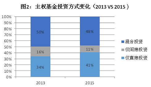 相关主权基金在本国经济发展中积累了相当的经验,同时,考虑到间接投资需要支付高额的基金管理费,很多主权基金机构在国际基础设施投资中愈发倾向于采用直投方式,并且这一势头增长迅猛。Preqin数据显示,2013年投资基础设施的主权基金中大约有34%完全采用直投的方式,2015年这一比例上升至41%,投资基金中采用直接与间接混合投资方式的比重则达到89%(如图3所示)。[25]实际上,部分未采用直投方式的基金主要受到自身管理条例的限制,并且相关公司正积极推动基金运作规则的重新修订。比如,世界最大规模的挪威主权财富基金正推动改变公司管理条文中关于直接投资的限制,积极进入基础设施直接投资领域。[26]