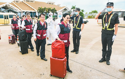 (六月八日,应孟加拉国政府邀请,中国政府援助孟加拉国抗疫医疗专家组从海口乘包机出发,赴孟加拉国帮助开展新冠肺炎疫情防控工作。)