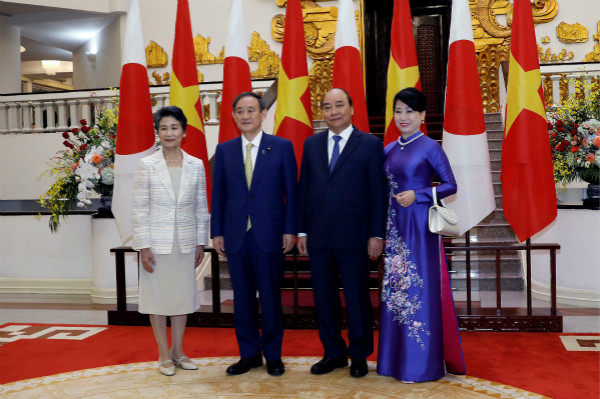 菅义伟夫妇19日出席越南总理阮春福夫妇举行的欢迎仪式。 IC图
