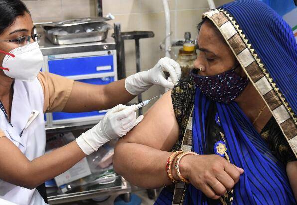 印度新德里,一位女士正在接种疫苗,图自澎湃影像。