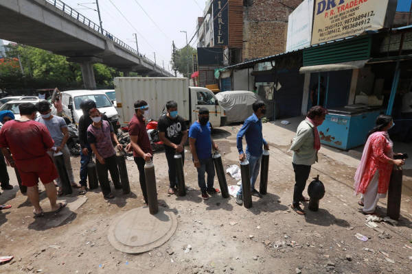 印度新德里,民众正排队等候充氧气瓶,图自澎湃影像。