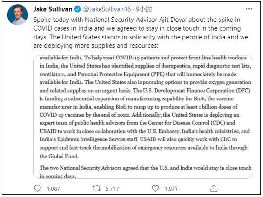 4月25日,美国国家安全顾问沙利文在推特发文称,美国将向印度“立即”提供生产印度国产疫苗Covishield所需的关键原材料、治疗药物、快速诊断试剂盒、呼吸机和个人防护服的供应,并考虑“紧急提供”医用氧气和相关物资。