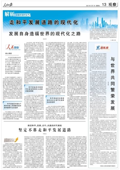 中华民族是爱好和平的民族,中国人民是爱好和平的人民。中国共产党带领人民不懈探索,走出了一条中国式现代化道路。在这个过程中,中国没有走一些西方国家的老路,而是坚持走和平发展道路,始终做世界和平的建设者、全球发展的贡献者、国际秩序的维护者。在全面建设社会主义现代化国家新征程上,我们坚定不移走和平发展道路,为世界和平与发展注入新的动力。《人民日报》观察版请多位学者撰文,围绕走和平发展道路的现代化这一主题进行阐释。以下为我院陈东晓院长的《与世界共同繁荣发展》一文。