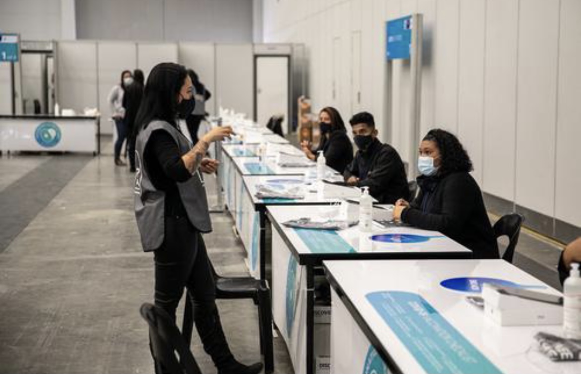 ▲ 7月6日,在南非开普敦国际会展中心,工作人员为疫苗接种中心启用做准备。| 新华社