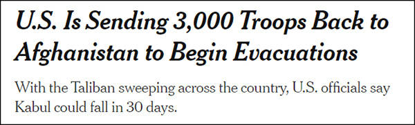 “美国正派3000士兵回到阿富汗协助撤离”,《纽约时报》报道截图