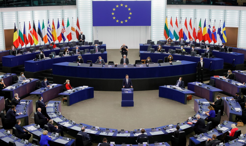 10月19日,在法国斯特拉斯堡,波兰总理莫拉维茨基在欧洲议会发言。由于波兰宪法法院做出波兰国内法律优先于欧洲联盟法律的裁决,莫拉维茨基当天在欧洲议会会议上遭到炮轰。媒体评论,欧盟与波兰长期因司法改革等问题僵持不下,如今已演变为“全面危机”。新华社 发
