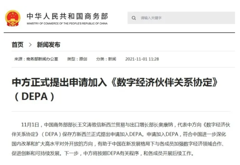 10月30日,习近平主席在二十国集团(G20)领导人第十六次峰会第一阶段会议上宣布中国决定申请加入《数字经济伙伴关系协定》(DEPA)的消息引发广泛关注。11月1日,中国商务部部长王文涛致信新西兰贸易与出口增长部长奥康纳,代表中方向DEPA保存方新西兰正式提出申请加入DEPA。这展现了中国积极参与数字经济国际合作及相关规则制定的建设性姿态。