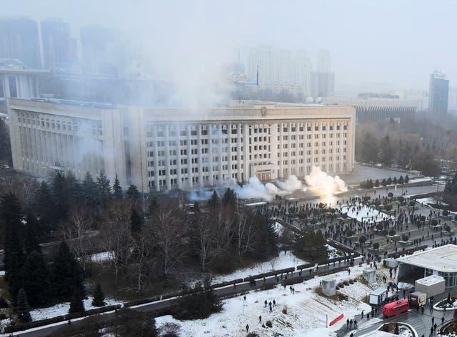 5日下午,上千人闯进阿拉木图市政府大楼,暴力纵火并破坏公共财产。他们还冲击当地检察院、哈国家电视台办公楼、哈执政党“祖国之光”党地方办公室等地。