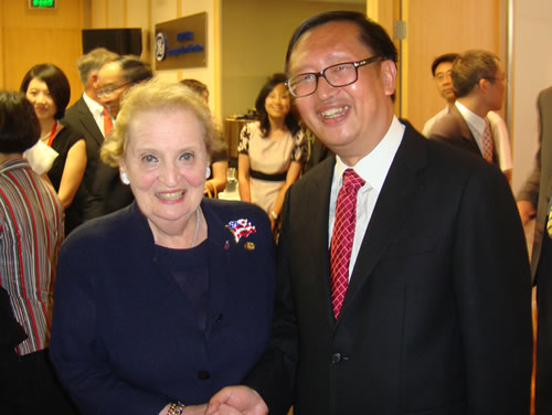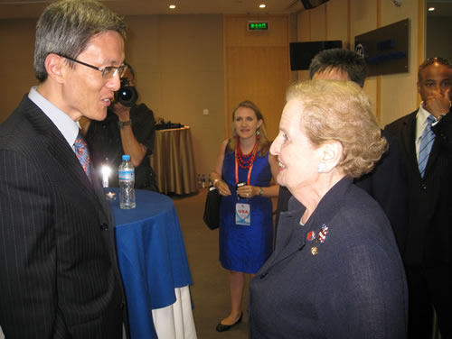 7月2日,杨洁勉院长和陈东晓副院长出席世博会美国国家馆日招待会,并同美国前国务卿奥尔布赖特交谈。