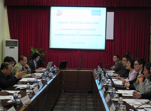 2010年3月11日至3月15日,上海国际问题研究院一行六人在陈东晓副院长的带领下,访问了越南外交部及相关研究机构,展开了内容丰富的学术交流。 随同出行的研究人员有亚太研究中心马孆主任、外交政策所副所长吴莼思、国际战略所所长助理牛海彬,全球治理研究所地区合作室主任祝鸣、外交政策所周士新。附:中国驻越南大使馆相关报道孙国祥大使会见上海国际问题研究院代表团http://vn.china-embassy.org/chn/xwdt/t663343.htm与中国驻越南大使孙国祥合影与越南副外长裴青山合影与越南外交部东北亚司司长Bui Trong Van 进行座谈