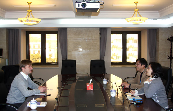 外交学院国际关系系外教Daniel Krahl来访我院 2016年09月10日 2月23日,外交学院国际关系系外教Daniel Krahl来访我院,与亚非研究中心主任李伟建及研究人员张玫就中国的中东政策及当前的中东局势进行了探讨。