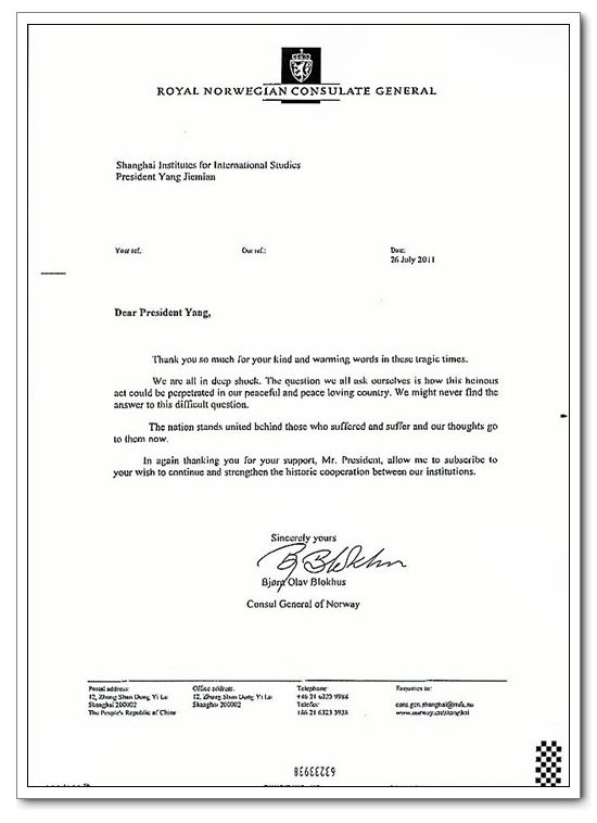 在举世震惊的奥斯陆惨案发生后,杨洁勉院长代表我院在第一时间向挪威驻上海总领馆发去了慰问信。在信中,杨洁勉院长向这起事件的遇难者家属表达了深切的慰问,并希望同挪威同伴一起,构建一个自由、平等、和平的未来。挪威驻沪总领事博雄先生在回信中对杨洁勉院长的慰问表示了真诚的感谢,并希望我院能和挪威的机构加强合作与联系。