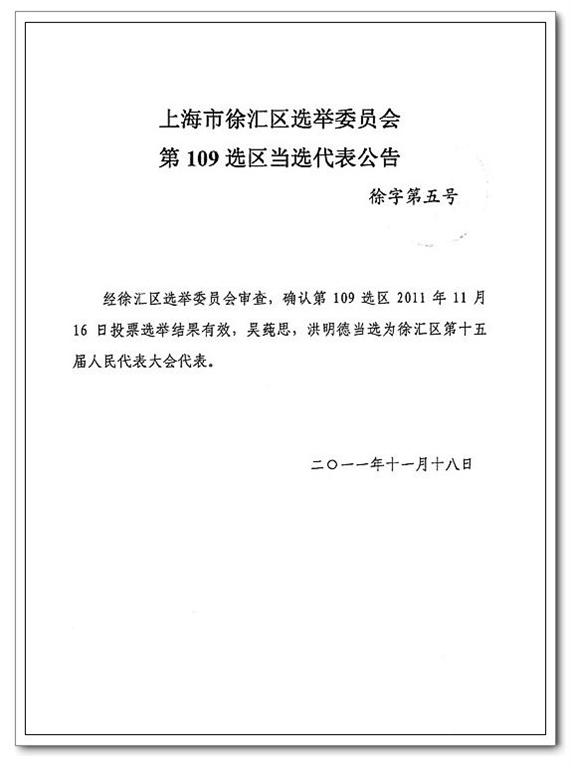 祝贺吴莼思同志当选为徐汇区第十五届人大代表
