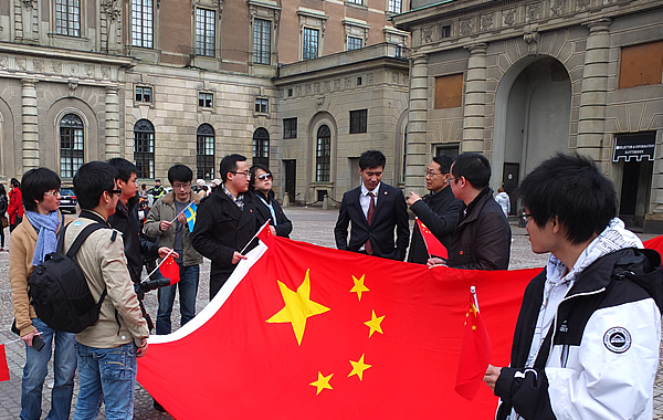 杨剑副院长与瑞典王宫广场上欢迎温家宝访欧的工作同志及留学生代表交谈