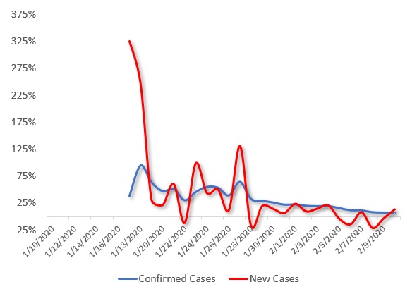 Moreover, the pace of the contagion is changing. The relative increase of the accumulated cases has decreased since mid-January. While the pace peaked at almost 100% after mid-January, it has declined to zero and below (Figure 1a). In turn, new cases increased steadily from mid-January soaring to almost 3,900 on February 4. But since then the numbers have fallen below 2,600 – from daily increase of almost 350% to zero and below (Figure 1b).