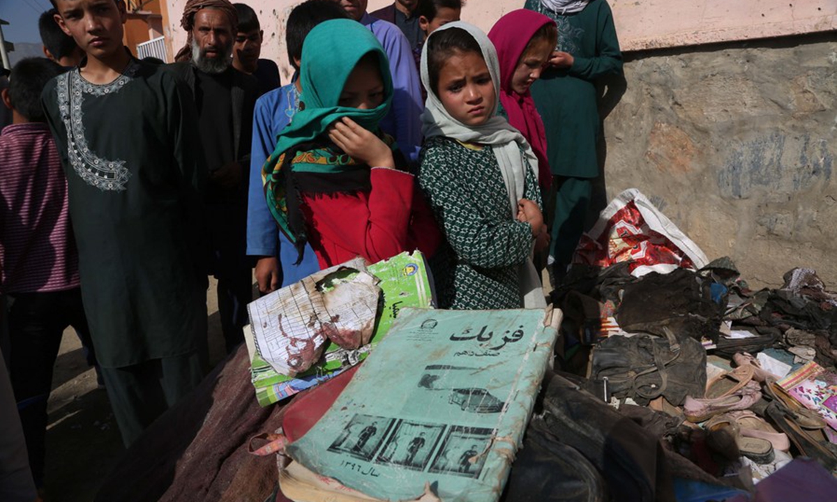 Photo taken on May 9, 2021 shows the books of students who were killed in a car bomb attack at the site of explosion in Kabul, capital of Afghanistan. Photo: Xinhua