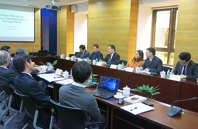 On March 8, 2017, SIIS President Chen Dongxiao met with a delegation of the Japan Institute of International Affairs led by Dr. Seiichiro Takagi, senior fellow of JIIA. The delegation was joined by Dr. Fumiaki KUBO, Professor of University of Tokyo, Dr. Toshihiro NAKAYAMA, Professor of Keio University, Dr. Satoru MORI, Professor of Hosei University, Dr. Kazuhiro MAESHIMA, Professor of Sophia University and Mr. Shinya KADOZAKI, Research fellow of JIIA. The two sides had a discussion on the U.S. domestic politics and foreign policy under Trump administration. SIIS research fellows from the Center for American Studies and Asia-Pacific Studies attended the meeting.