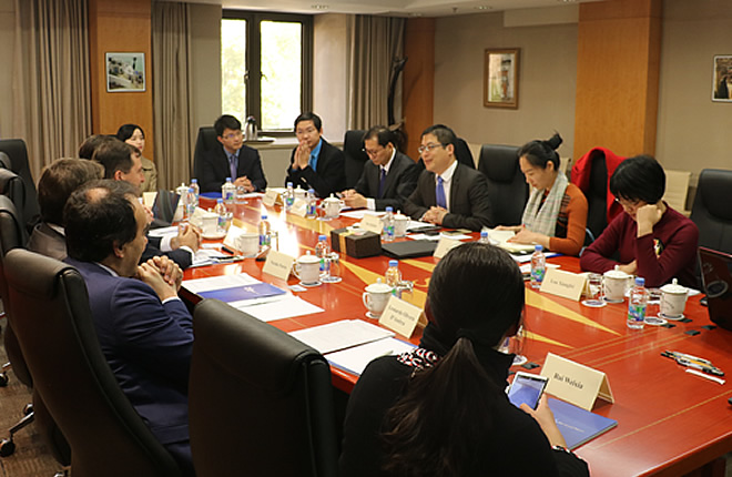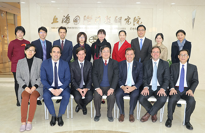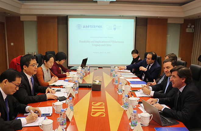 On March 14, 2017, the delegation led by Mr. Fernando Lugris, Uruguayan Ambassador to China, visited SIIS and shared their views on the possibility and implications of FTA between Uruguay and China. The Uruguayan participants included Dr. Ignacio Bartesaghi, Director of Department of International Negotiations and Integration, Catholic University of Uruguay and Mr. Leonardo Olivera D’Andrea, Consul General of Uruguay in Shanghai. Participants from the Shanghai Agricultural Assets & Equity Exchange, Shanghai Technology Innovation Center, SafBon Water Service (Holding) Inc, and Yiwu Kingtop Imp & Exp Co. Ltd joined the meeting. SIIS Vice President Yan Anlin met with the delegation. Dr. Niu Haibin, Deputy Director of the Center for American Studies, Dr. Lou Xiangfei, research fellow of the Center for American Studies, and Dr. Wang Yuzhu, research fellow of the Institute for World Economy Studies participated in the discussion.