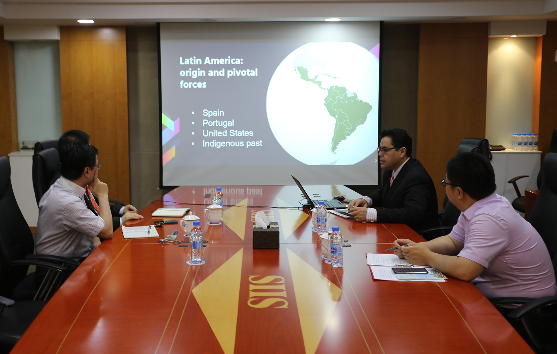 On July 8, 2019, Professor Abelardo Rodríguez from the Ibero-American University (Mexico) visited Shanghai Institutes for International Studies and had a dialogue with Dr. Niu Haibin, deputy director of Center for American Studies of SIIS and Dr. Xue Chen, associate research fellow of Institute for International Strategic Studies of SIIS on China-US relations and China-Latin America relations.