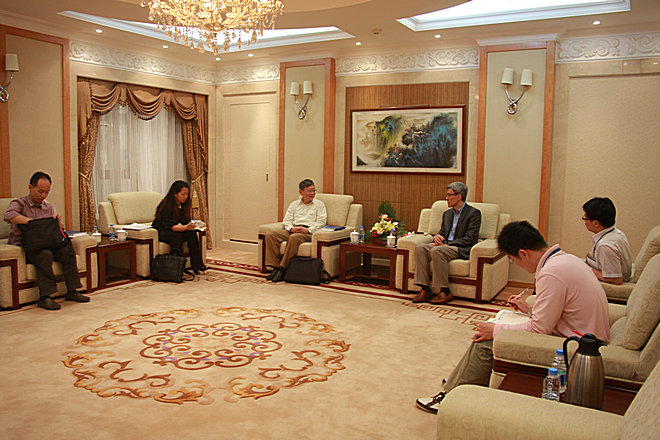On July 4, President Chen Dongxiao meets with Mr. Hu Dawei, consultant of Shanghai Century Publishing Group, and has a d