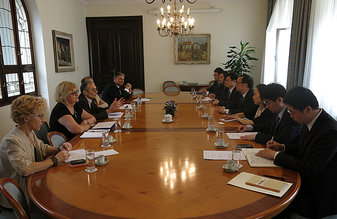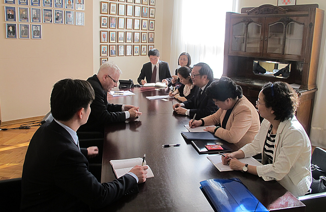 2015年6月4日至7日,我院学术委员会主任杨洁勉率团访问克罗地亚。访问期间,代表团拜会克前总统约西波维奇,并同克外交部政策司负责人盖夫兰、主管亚太事务的部长助理马尔科维奇、主管欧洲事务的部长助理马鲁斯奇、萨格勒布大学校长博拉斯等进行交流。双方就中克关系、中国—中东欧国家合作、我“一带一路”战略规划、欧洲政治、经济、安全形势等深入交换意见。