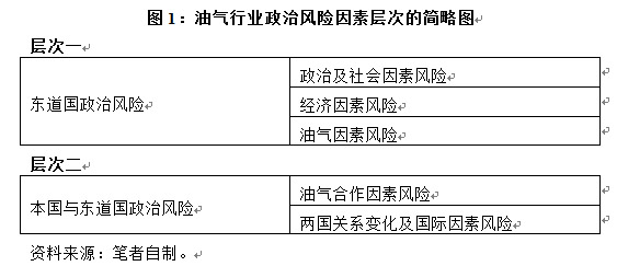 腊克斯(H. L. Lax)指出,除了与行业相关的某些因素与指标,政治风险还应包括一些可能在宏观层次上影响该行业的变量,如普通政治、经济及社会风险。这些风险因素的指标包括汇率波动、不利的收支平衡局面、战争威胁、不稳定的政治与经济环境、恐怖主义、国民与劳工骚乱及其他因素。可以说,这些宏观因素及指标不仅可能会影响到特定行业,也可能影响到经济中的任何部门。同时,在微观层面上,特定行业如石油天然气行业会受一些特定因素影响,如环保活动、能源漏洞和石油投资限制等。分析师在进行政治风险分析时应注意到这些“特有的、特定行业的微观政治风险,同时也考虑到普遍的宏观政治风险”。[22] 霍马克(T. Hallmark)也认为,“在进行政治风险评估时,对宏观及微观风险进行基本区别很重要”:[23] 如战争、恐怖主义、劳工骚乱、政治不稳、腐败等属于宏观风险,它们以不同程度影响到几乎所有的行业与部门;其他因素如能源漏洞、环保运动及石油天然气出口限制,则属于微观风险,是仅影响石油天然气行业的特定行业因素。在进行政治风险分析时,应同时考虑宏观变量与微观变量,并了解到微观变量可能会因特定行业的特性而有大得多的影响效果。基于上述考虑,在构建政治风险的分析框架时,需要区分有差异性的特定公司(微观)政治风险,与不直接指向特定公司但遍及全国的宏观政治风险。例如,下图1提供了研究油气行业政治风险因素层次的简略图,主要分为东道国政治风险和投资国与东道国关系政治风险两个层次。东道国政治风险包含三个核心风险因素:包括政治环境、游戏规则、司法体系与法律、腐败、商业行政压力、国家控制战略资产整顿、资源民族主义、地缘政治风险、战争与安全等的政治和社会风险;主要集中于经济总体表现的经济风险;主要分析东道国对外国投资在石油天然气行业影响的案例的油气风险。投资国与东道国关系政治风险重点关注两国关系如何影响油气行业的投资,包含油气合作因素风险和两国关系变化及国际因素风险等。