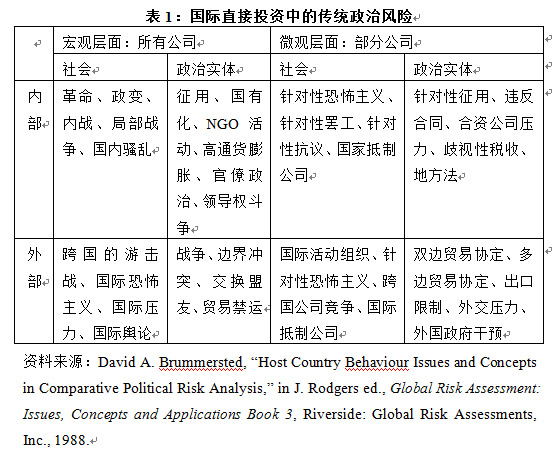 企业对外投资中的传统政治风险一般指由于东道国国内的政治环境或政策出现变化而造成跨国公司损失的风险。这种风险可能是东道国出于自身利益直接没收跨国公司资产,或变更国家政策来限制跨国公司的发展;也可能是东道国的政治出现巨大变革,如内战、政权被推翻和被侵略等,而造成跨国公司的资产无法获得正常的保障所带来的损失。大卫·布鲁门斯德(David A. Brummersted)对国际直接投资中的传统政治风险进行了归纳(表1)。