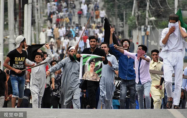 当地时间2019年8月9日,印控克什米尔地区,当地宵禁进入第五天,克什米尔居民参加抗议印度政府撤销有争议的第370条活动。图片来源@视觉中国