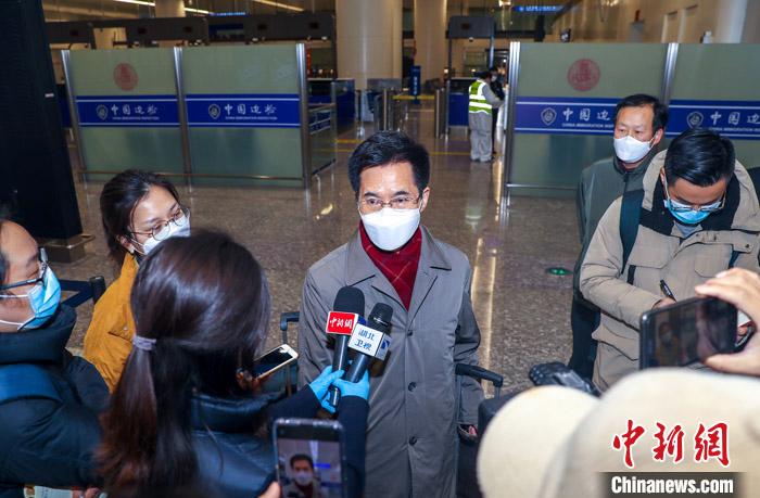 图为韩国新任驻武汉总领事姜承锡在机场接受记者采访